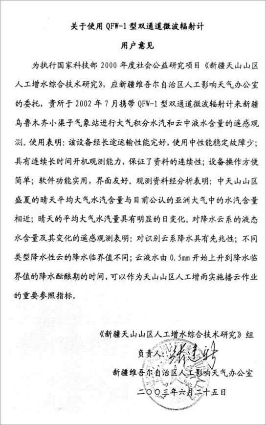 為執(zhí)行國家科技部2000年度社會公益研究項目《新疆天山山區(qū)人工增水綜合技術研究》,應新疆維吾爾自治區(qū)人工影響天氣辦公室的委托,貴所于2002年7月攜帶QFW-1型雙通道微波輻射計來新疆烏魯木齊小渠子氣象站進行大氣積分水汽和云中液水含量的遙感觀測。使用表明:該設備經(jīng)長途運輸性能完好,使用中性能穩(wěn)定故障少;具有連續(xù)長時間開機觀測能力,保證了資料的連續(xù)性;設備擦做方便簡單;軟件功能使用,界面美觀。觀測資料經(jīng)分析表明:中天山山區(qū)盛夏的晴天平均大氣水汽含量與目前公認的亞洲大氣中的水汽含量相近;晴天的平均大氣水汽量具有明顯的日變化。對降水云系的業(yè)態(tài)水含量及其變化的遙感觀測表明:對識別云系降水具有先兆性;不同類型降水性云的降水臨界值不同;云液水由0.5mm開始上升到降水臨界值得降水醞釀期的時間,可以作為天山山區(qū)人工增雨實施播云作業(yè)的重要參照指標.